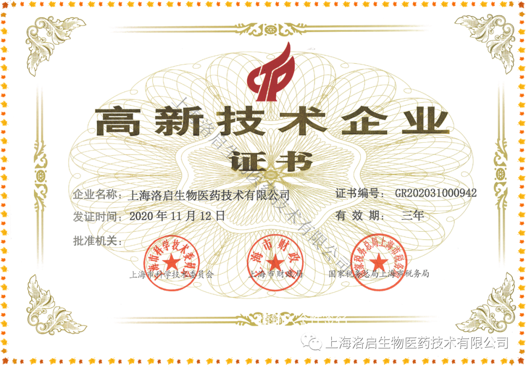近期,上海凯发K8天生赢家一触即发生物医药技术有限公司取得了由上海市科学技术委员会、上海市财政局、国家税务总局上海市税务局联合颁发的“高新技术企业证书”。